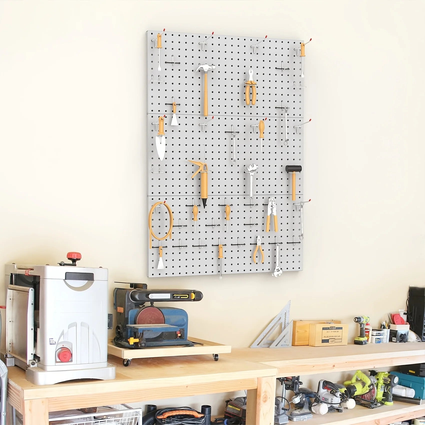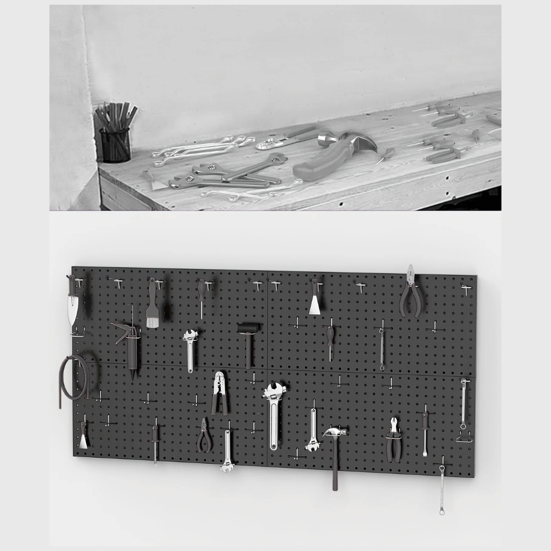 • Heavy-duty steel pegboard panel built for tools and workshop hardware